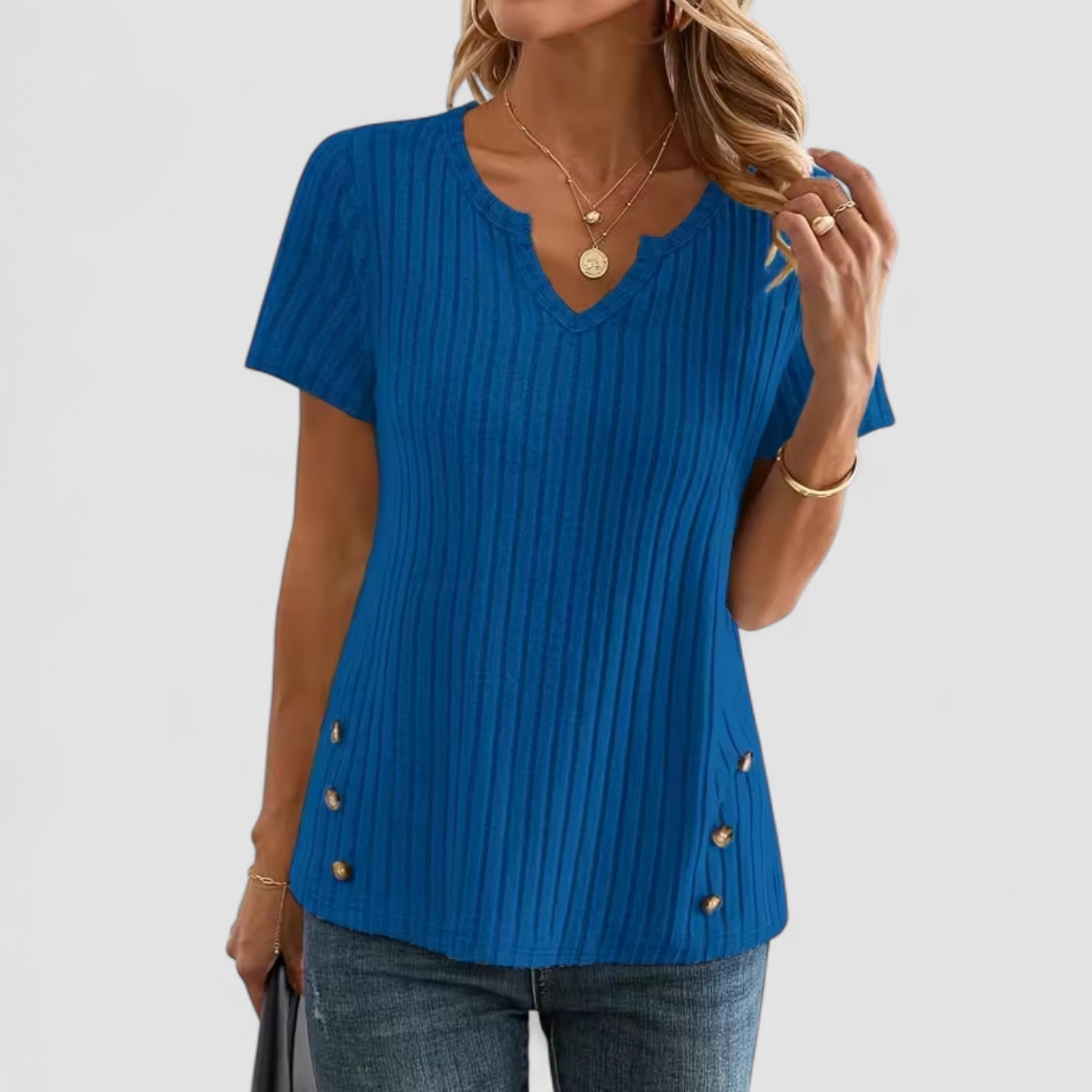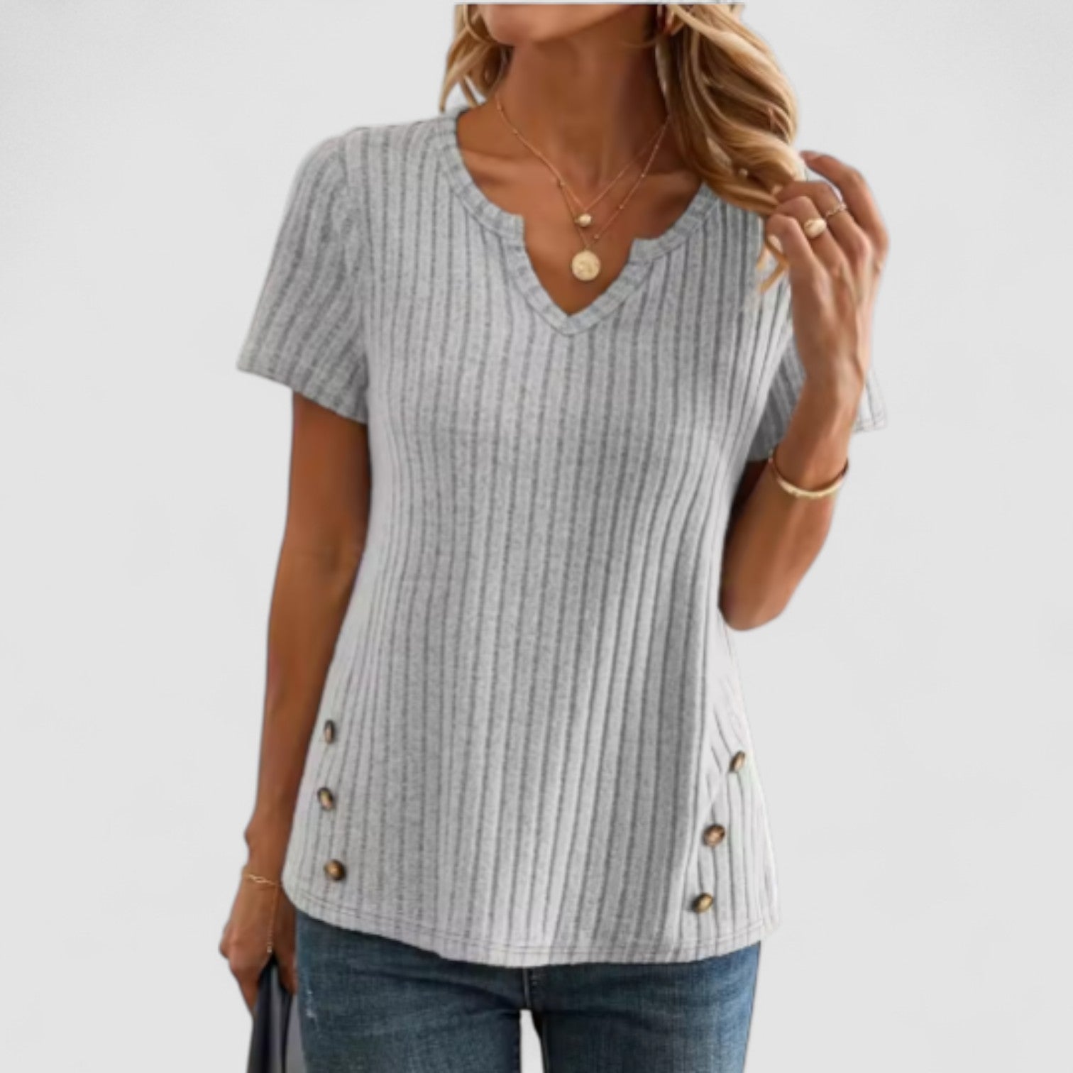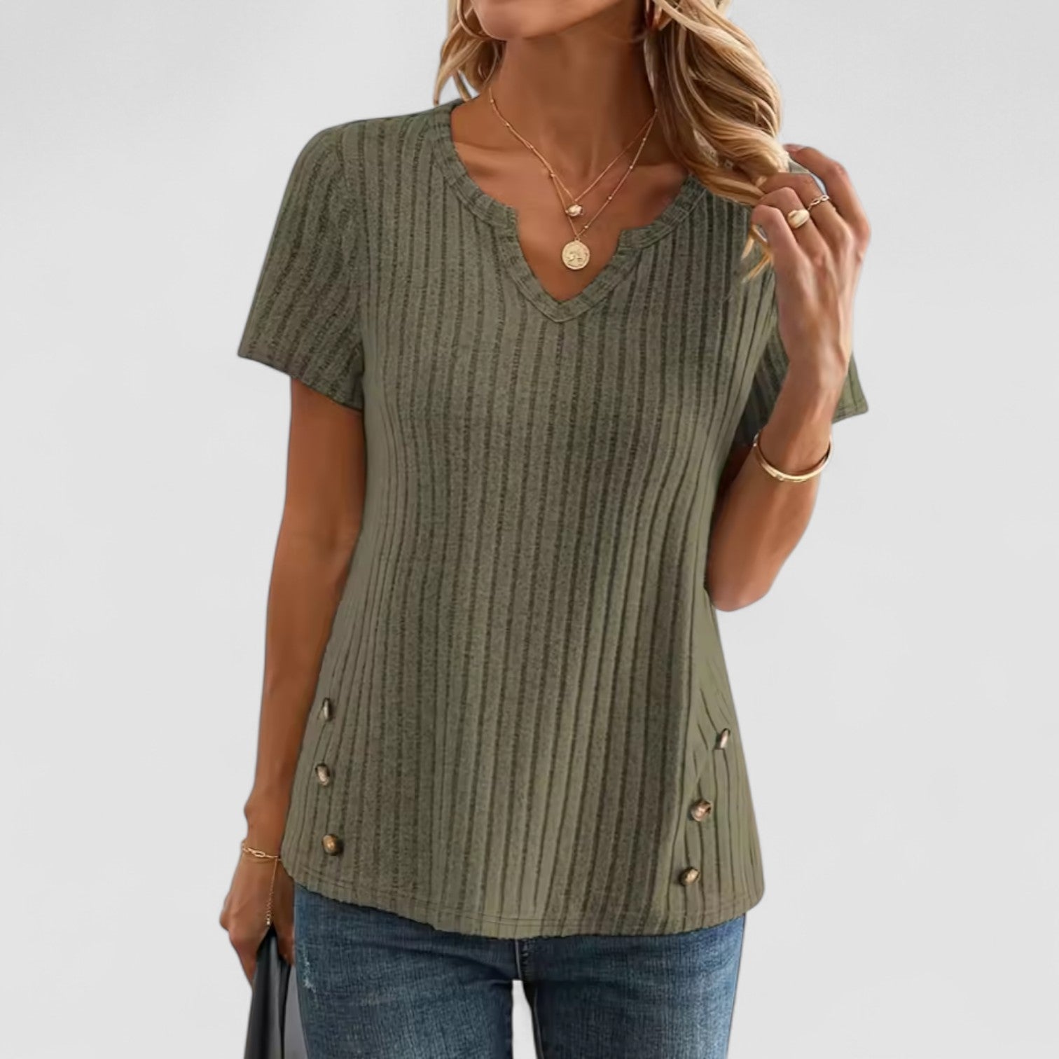 Haut MaisonNord™ | Thora avec détails de boutons. Le haut a une coupe décontractée et est fabriqué dans un matériau doux avec une texture discrète. Le décolleté en V ouvert met en valeur une ligne féminine, tandis que les manches courtes offrent confort et liberté de mouvement. Les détails latéraux avec boutons ajoutent une touche simple et réfléchie.